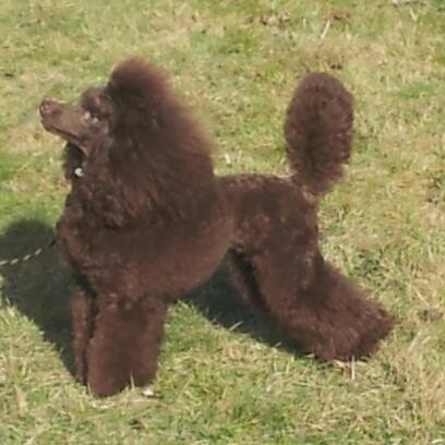 Very feminin stylish 12 month oldbrown. Refined head with excellent eyeform and colour. Well set ears to the canine. Excellent front. Ribcage ok for age. Slightly loose in elbows. Pretty picture.Well presented. Moves ok.