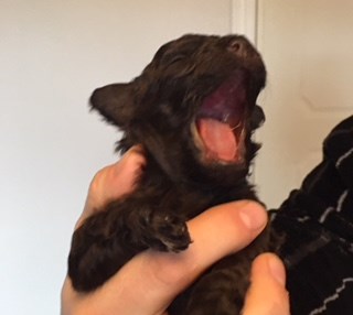 De väger idag:brun hane 570 gram - vid födseln 202, svart hane 615- vid födseln 222, svart hane med prick på svansen 515- vid födseln 172 och brun hane med prick på svansen 495 gram. Klorna ska klippas igen, behöver bara lite håll -i- hjälp då den vänstra handen inte är något att lita på ännu ;)