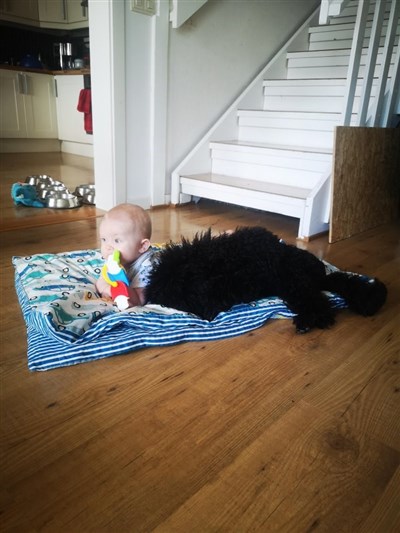 Peggy 5.5 månad med sin älskade pälstrasa. Den ligger hon och gosar runt med varenda kväll. Antingen på golvet eller i soffan.