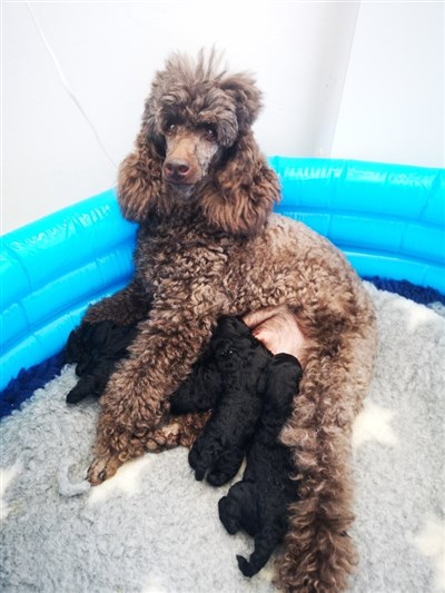 Ebba väckte mig kl.03.00 imorse och ville gå ut. Väl uppe i sängen efter att ha uträttat sina behov ute började hon hjässa lite och bädda runt så då fick hon ta plats i valplådan. 04.45 kom första valpen och strax efter kl. 07.00 så kom den sista. 5 svarta fina valpar med god aptit på livet blev det, 3 hanar och 2 tikar. Alla har bra storlek, ser fina och friska ut och tog snabbt tutte.